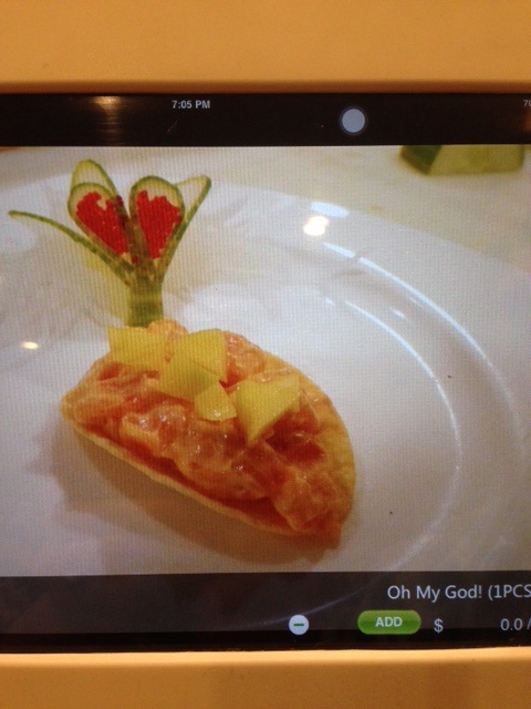 Dad, Ben and I went out for all you can eat sushi tonight. Our original sushi plan was foiled by a 30 minute wait so we went across the street to another smaller, more dodgy sushi place. As we walked in it became very clear everyone sitting in the centre of the restaurant knew each other and they were all very odd. What we decided was that it was either an impromptu trekkie parade, special bronies brigade or just an inbred science experiment that results from the family tree not branching out. We over ate, people watched and laughed until we choked on oddly oversized yam sushi rolls. I dared Ben to order this, mainly because of the name among other things…IMG_2326